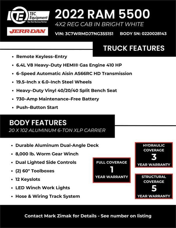 NEW 2022 DODGE RAM 5500 WITH HEMI GAS ENGINE. 20'X 102" ALUMINUM JERRDAN BED. CONTACT MARK @ TEC EQUIPMENT LATHROP FOR MORE INFORMATION Jerr-Dan Century Vulcan Chevron